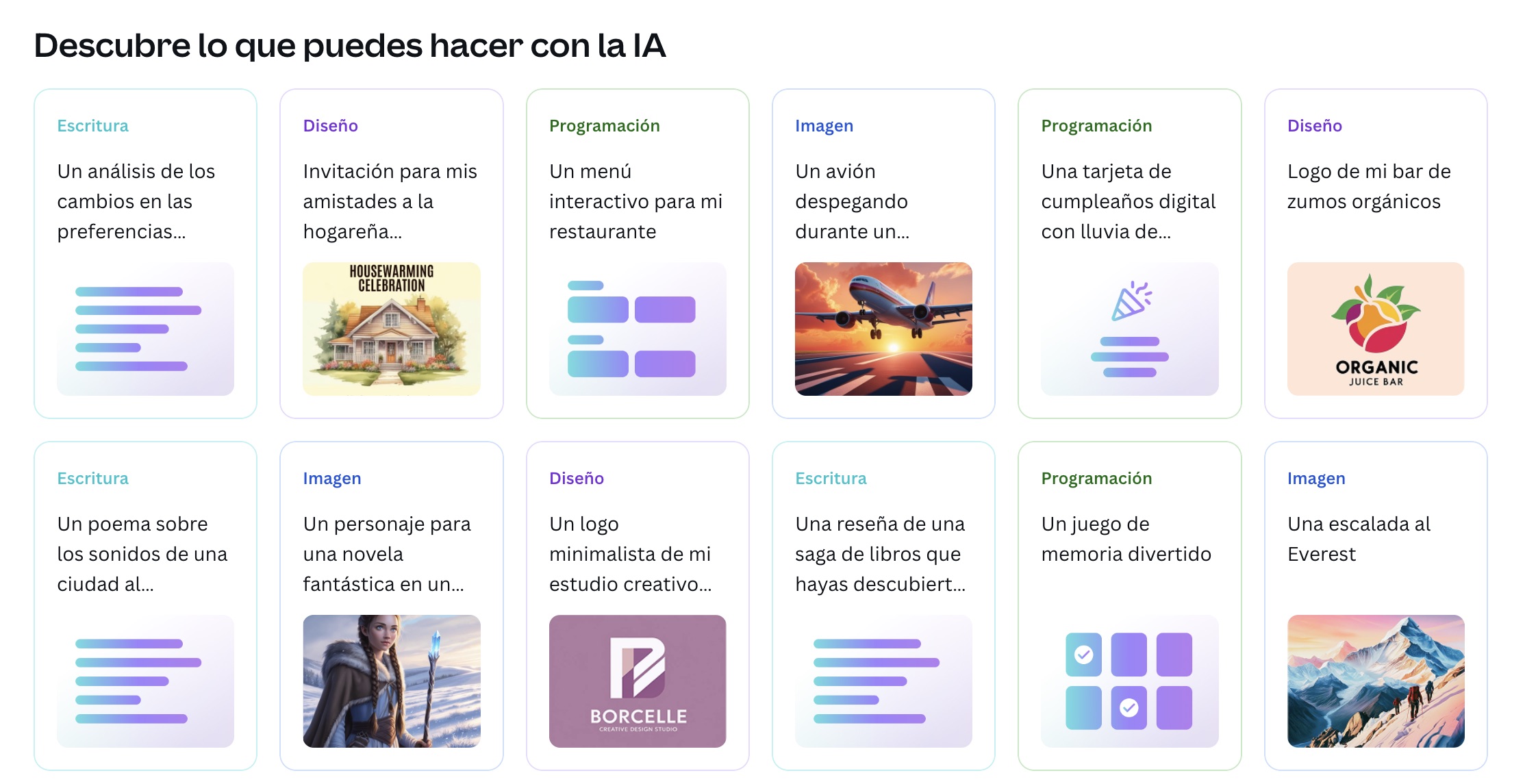 Canva incorpora “Magic Design”, una función que genera diseños completos a partir de texto o imágenes. Ofrece herramientas de redimensión automática, eliminación de fondo, generación de texto e imágenes con IA, y sugerencias inteligentes de color y tipografía. También permite crear logos, presentaciones, y publicaciones para redes sociales de forma automatizada.