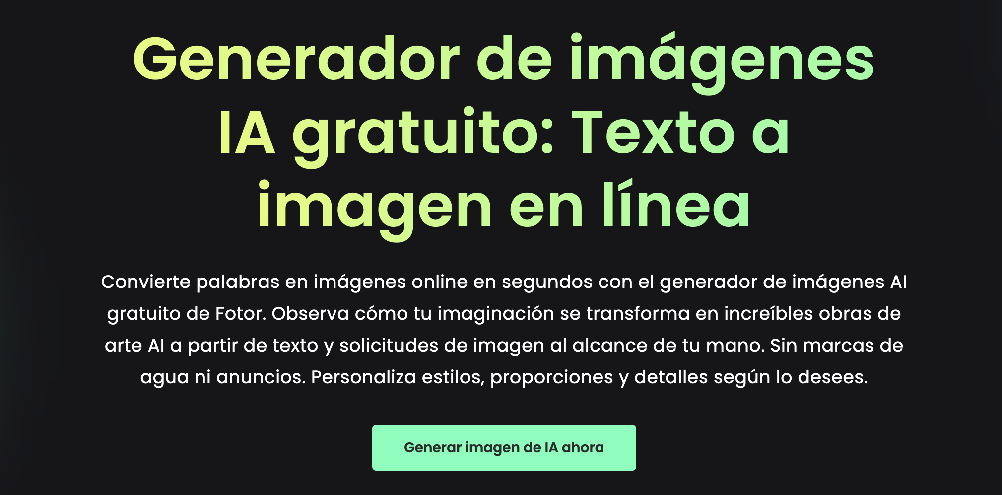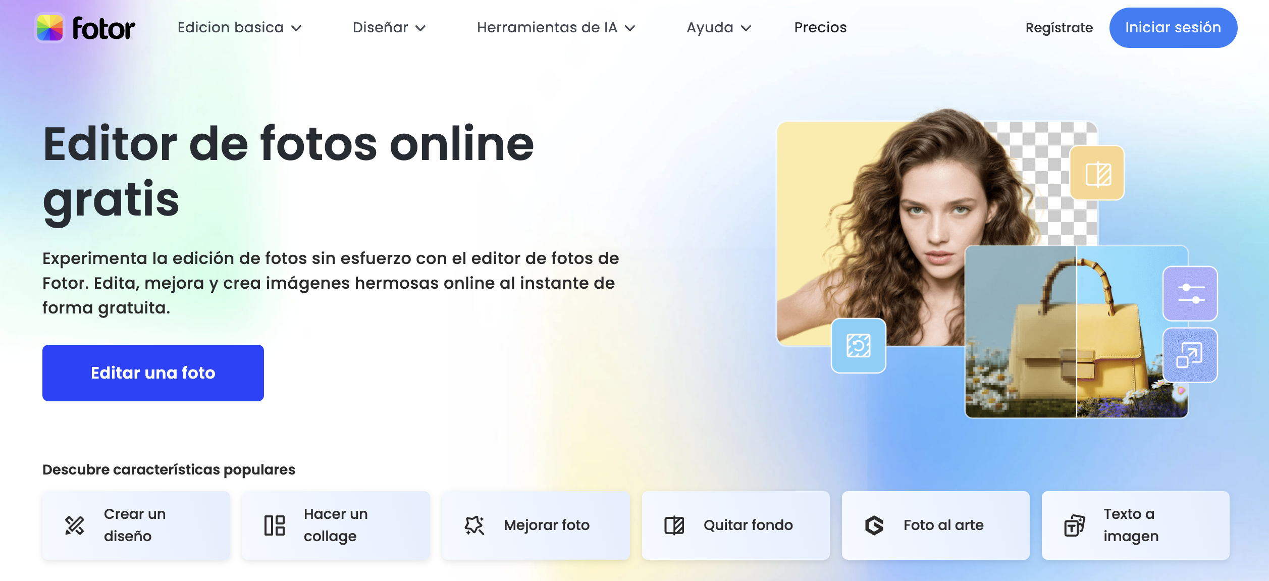 Fotor usa IA para edición automática de imágenes: eliminación de fondo, mejora facial, retoque fotográfico, generación de imágenes desde texto y creación de diseños publicitarios. Ideal para usuarios sin experiencia en diseño.