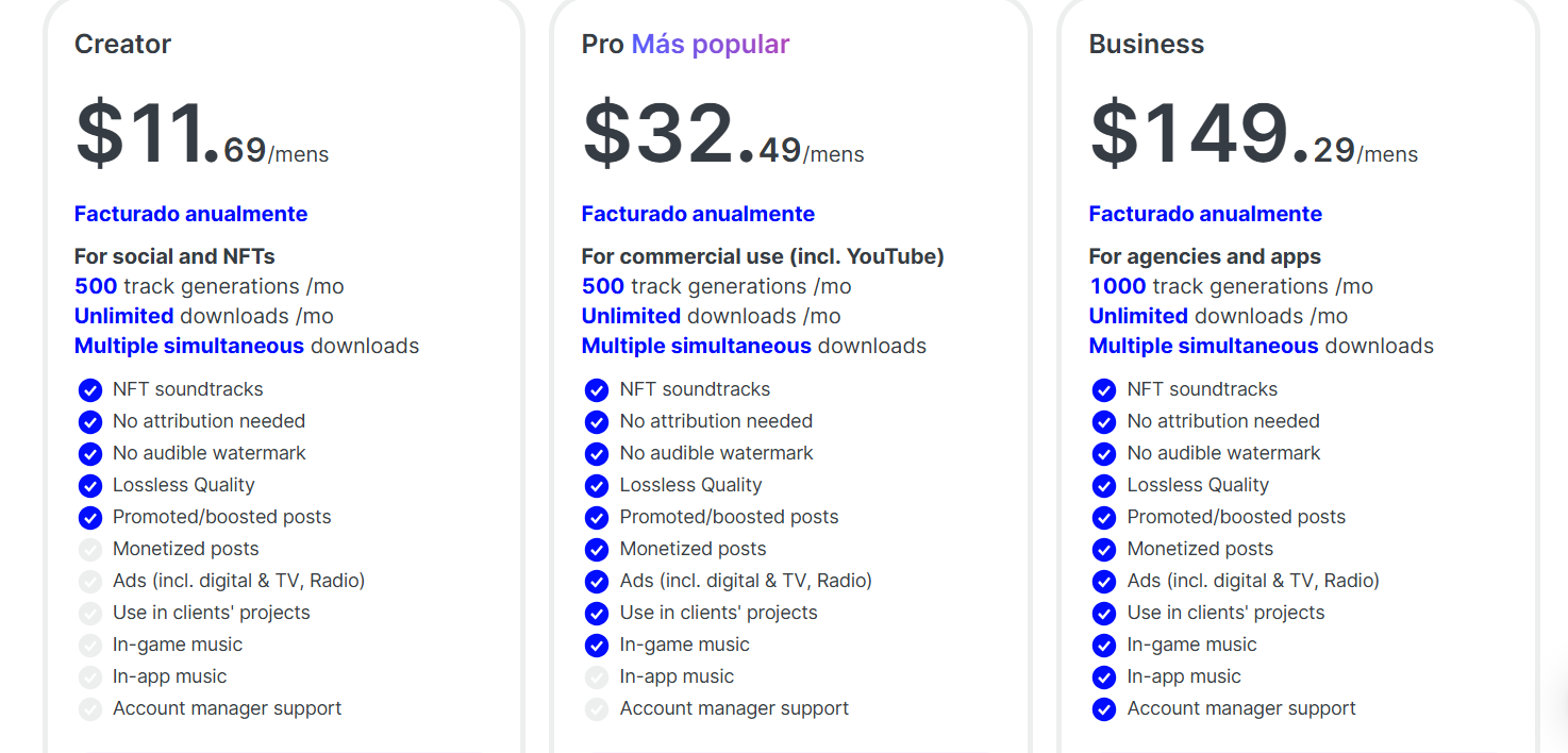Algunas de sus funciones son la generación instantánea de música IA, mezcla de muestras humanas con sonidos proporcionado con algoritmos, integración de la música generada en aplicaciones juegos o productos web, licencia libre de regalías, transformación de texto a música...