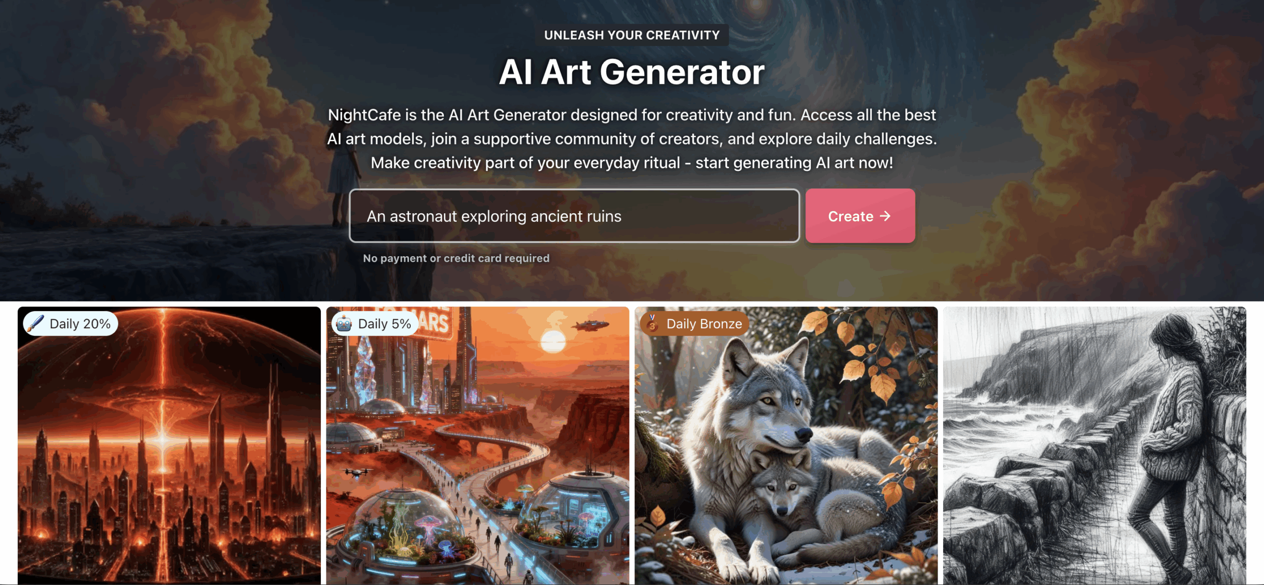 Generador de imágenes artísticas mediante IA (texto → imagen) con créditos mensuales y comunidad integrada, buen recurso para diseño conceptual o fondo visual.