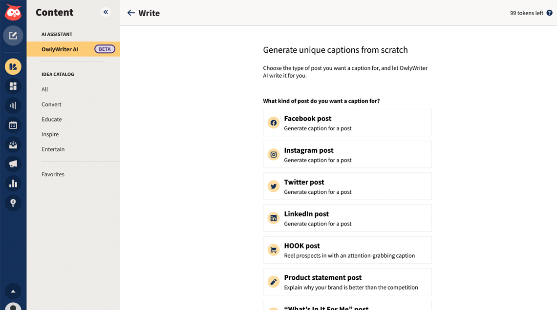 OwlyWriter AI es una herramienta que sirve para crear contenido para redes sociales de forma más eficaz y ahorrar tiempo de trabajo. OwlyWriter puede escribir publicaciones basadas en enlaces, generar ideas para publicar en base a palabras claves o temas, identificar y reutilizar publicaciones de mayor desempeño, etc.