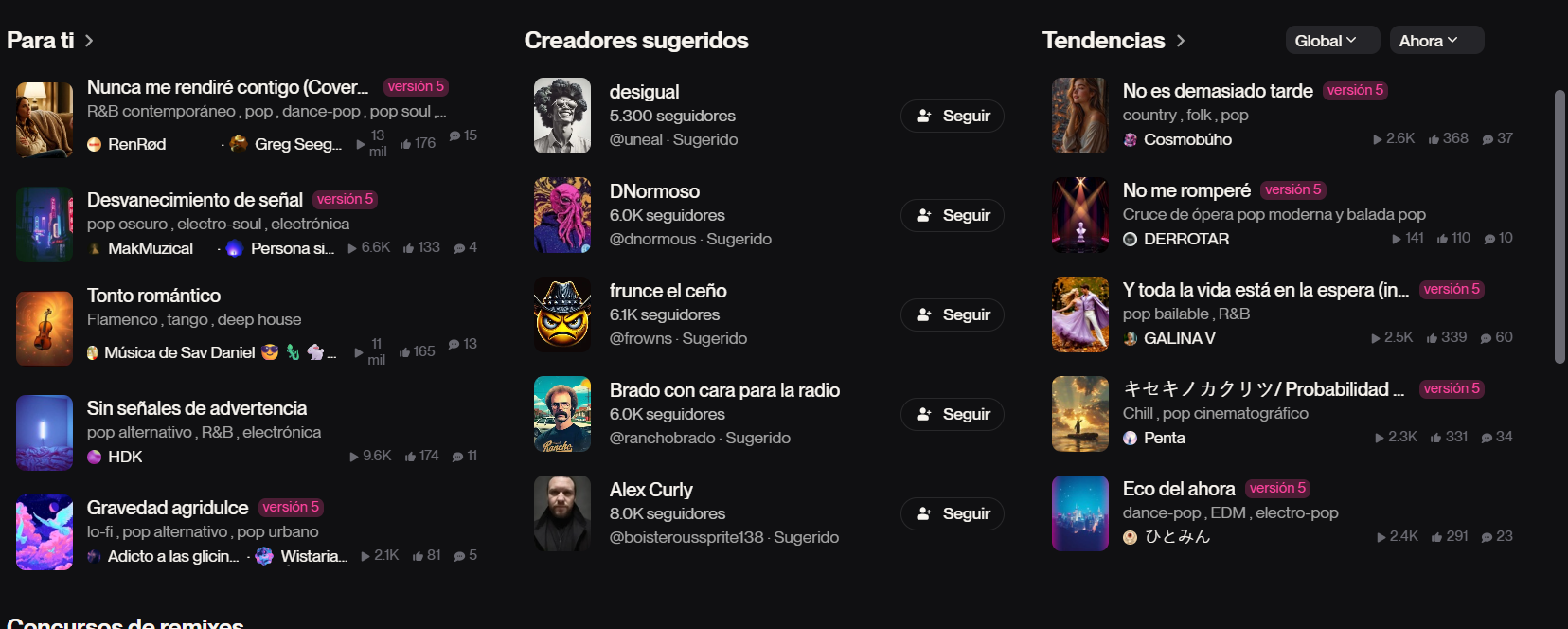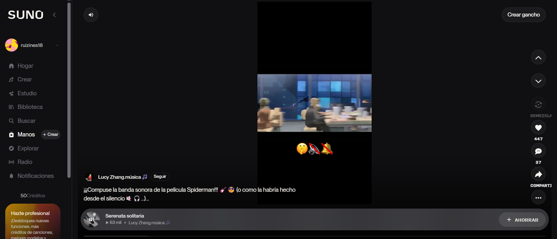 Aplicación que permite crear canciones en segundos mediante la inteligencia artificial. La app permite crear canciones mediante una letra que tengas en mente, una melodía o incluso un sentimiento. Permite la creación de 10 canciones de forma gratuita. Además, puedes escuchar canciones creadas por otras personas y acceder a herramientas de edición profesional en el plan premium.