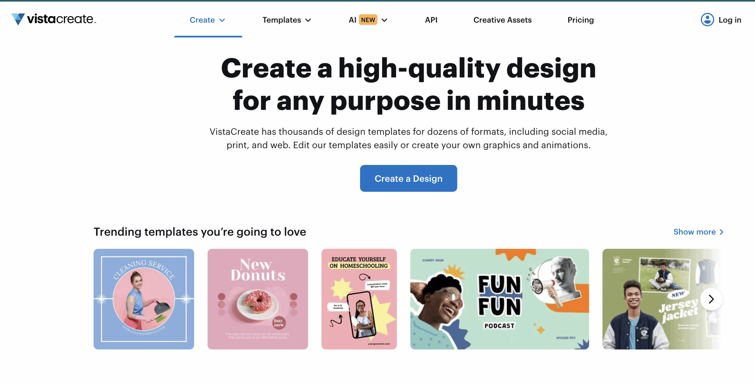 VistaCreate ofrece diseño automatizado con plantillas inteligentes, ajuste automático de formato y sugerencias visuales. Permite crear publicaciones para redes, anuncios y presentaciones con ayuda de IA, manteniendo coherencia visual en las marcas.