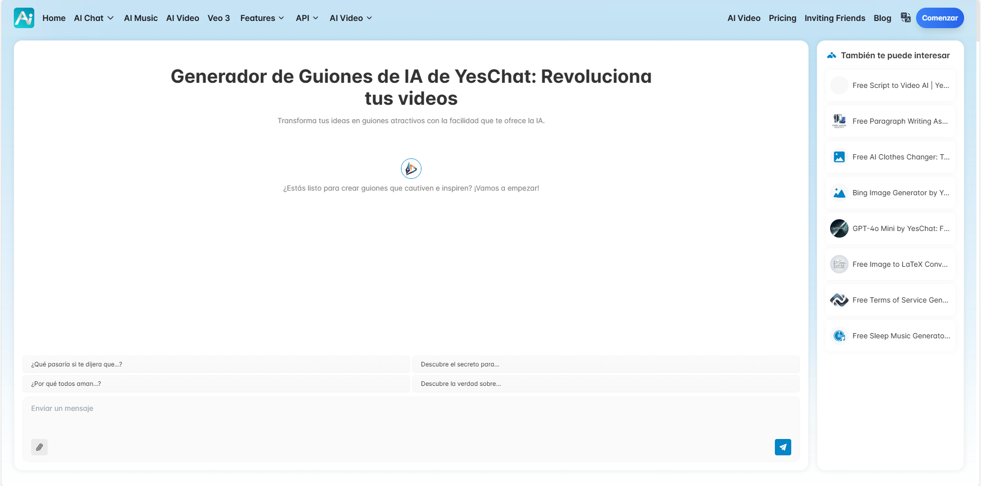Yes Chat Ai es una plataforma de inteligencia artificial ideada para los creadores de contenido que mediante diferentes herramientas te ayuda a crear tu propio contenido audiovisual.